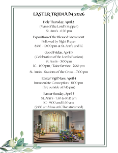 St. Ann’s on Instagram stannsmanlius HOLY WEEK 2026 ST ANN’S Holy Thursday 6:30pm Mass The St. Ann's 10th Grade Confirmation Class would Our Ash Wednesday Masses this year will be at 9am Due to current weather conditions there will be no Some Fr. Kevinisms to remember. This Saturday following the 4:30 Mass we will have Sunday (1/25/26) morning K-6 Faith Formation class 🥳 Happy birthday Dc. Bob! 🥳 Load More...